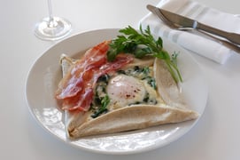 ほうれん草とベーコンとクリームソースのそば粉ガレット・アイントプフ(ドイツのじゃがいもとソーセージのスープ)・サーモンのチーズクリーム・ケールとオレンジのサラダ(玉ねぎと紅花油のドレッシング)・ベルギーワッフルを作ります。